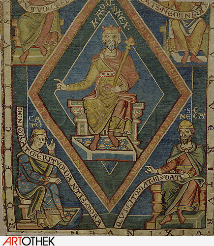 Bildtitel:Karlsteppich (Karl der Große mit den Philosophen Cato und Seneca). 13. Jh.